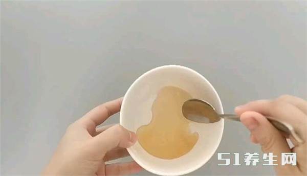 我们准备个容器在里面挤入大约两厘米左右的红霉素软膏。然后再加入大约两勺的蜂蜜。然后将它们混合均匀。
